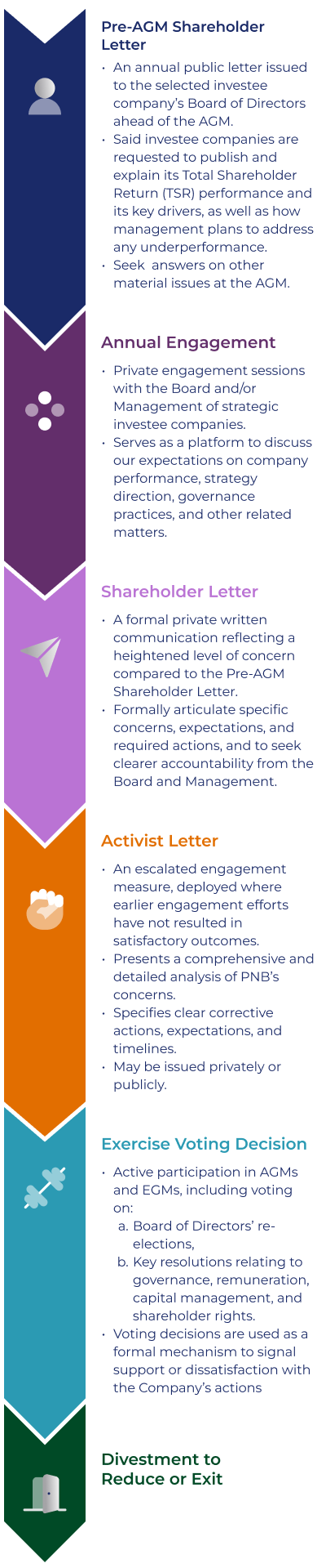 PNB places good governance and stewardship responsibilities as fundamental aspects of our operations. We extend these standards to our investee companies through consistent engagements to deliver long-term shareholder values.